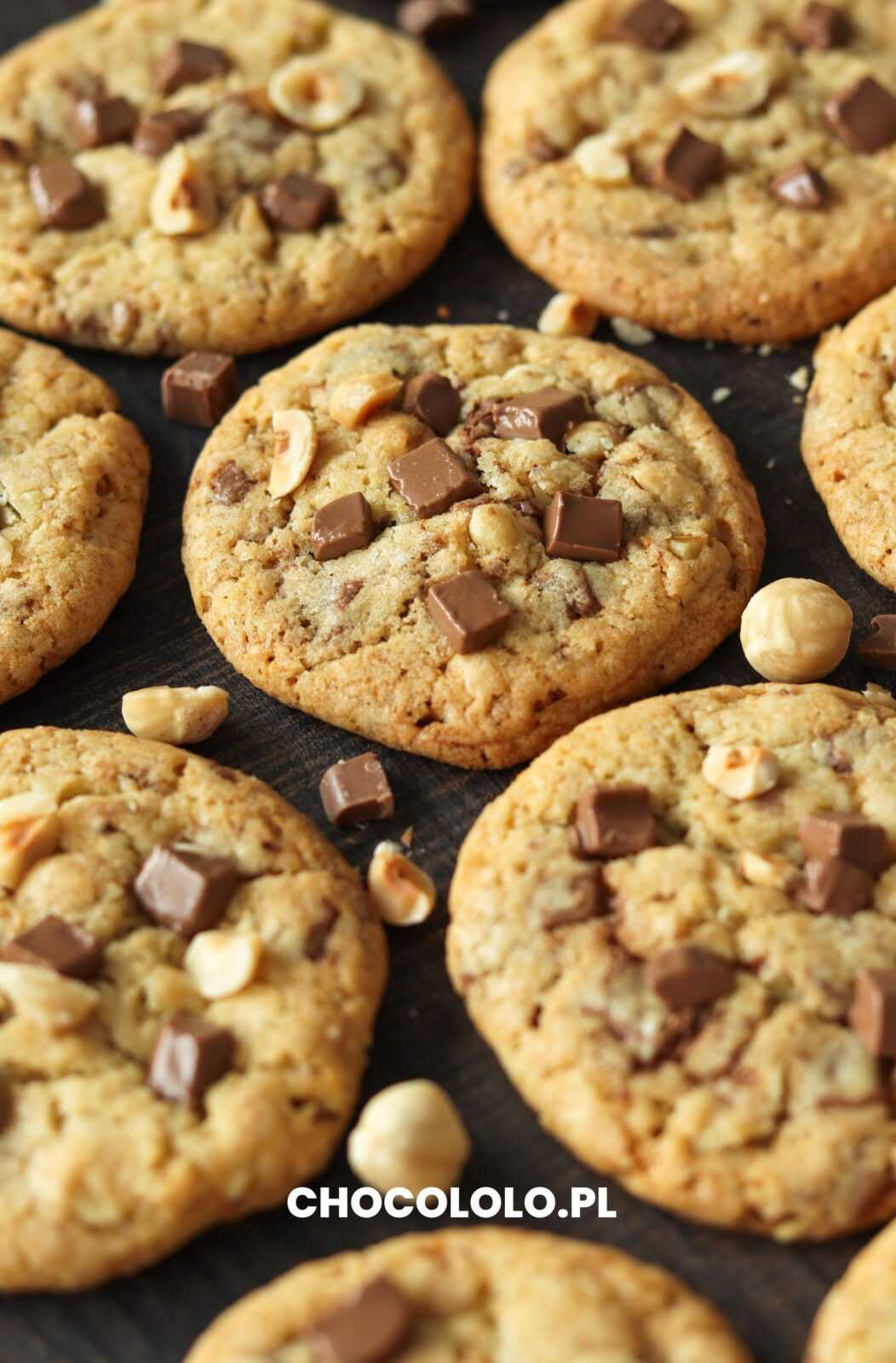 Kruche i chrupiące ciasteczka z orzechami laskowymi i mleczną czekoladą. Bardzo proste do przygotowania, pysznie maślane i cudnie rumiane. Oczywiście są dość słodkie, ale dzięki temu zachwycą Was wyjątkowo chrupkie i złociste brzegi. Połączenie czekolady i orzechów laskowych zawsze jest smaczne. Możecie wyposażyć się w dodatkowe 50 g czekolady i powciskać kawałki na wierzchu świeżo upieczonych ciastek. Dodatkowa porcja czekolady jest zawsze mile widziana. Małe kuleczki ciasta potrzebują sporo miejsca na blaszce, więc nie zapomnijcie zachować większych odstępów między porcjami. Po ostudzeniu szybko robią się kruche, o lekko karmelowym spodzie. Warto spróbować.