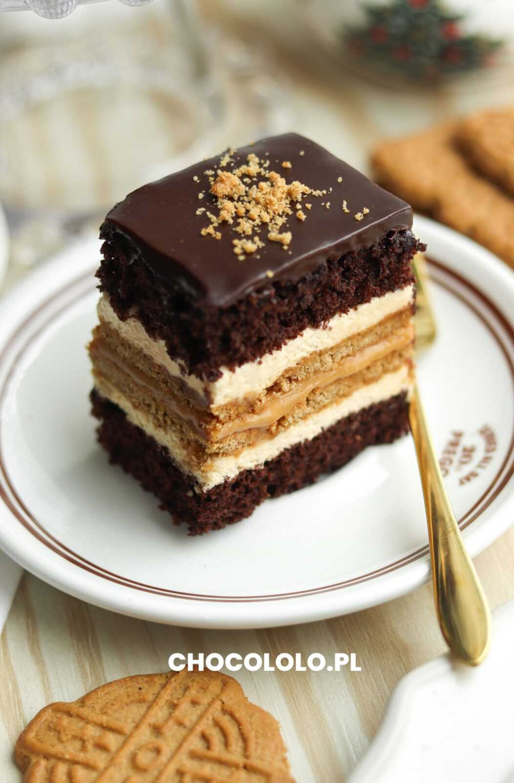 Pyszne, świąteczne ciasto czekoladowe z piernikową nutą, przełożone kremem z kajmakiem i korzennymi ciasteczkami.