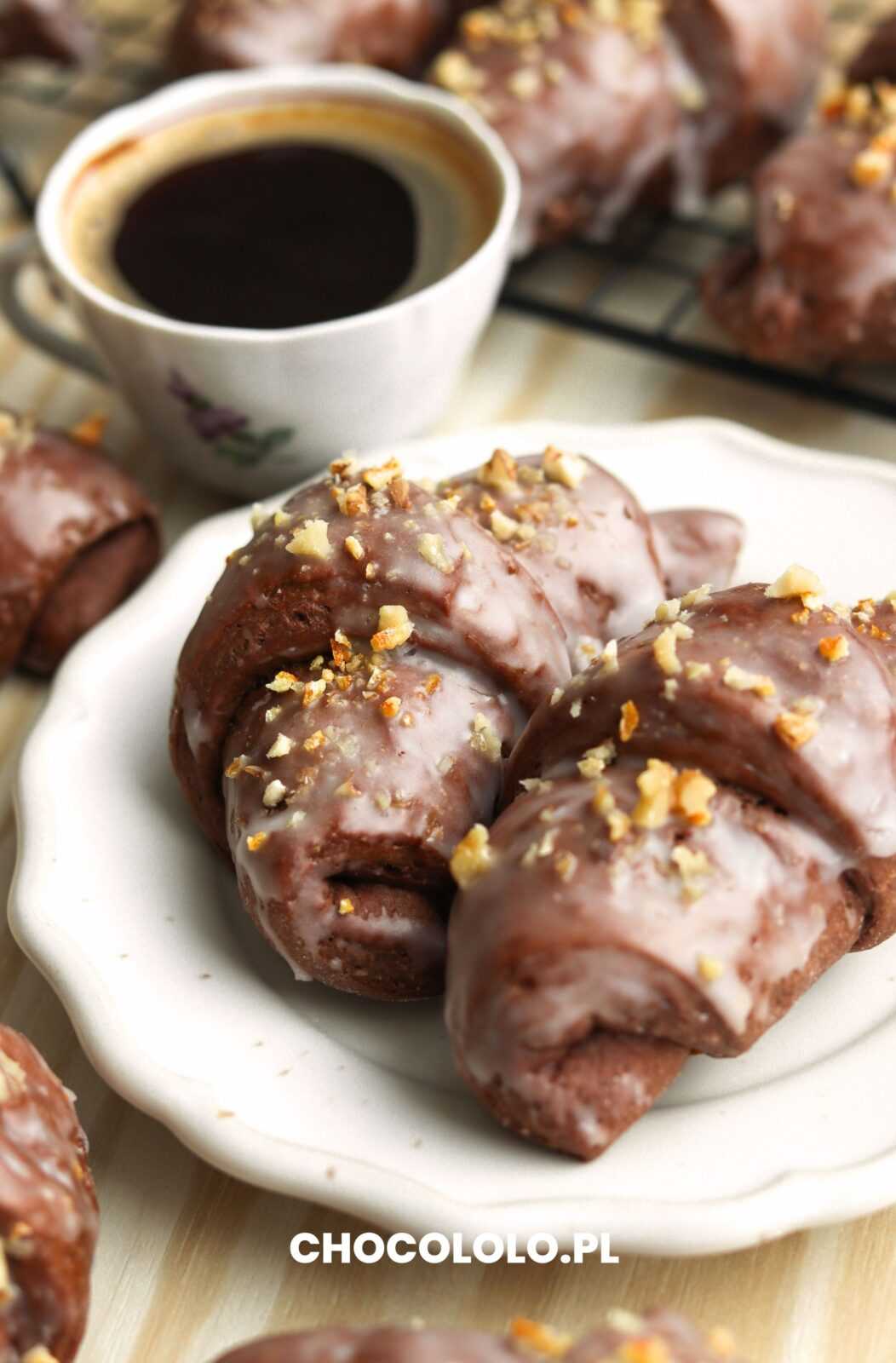 Te rogaliki zniknęły w okamgnieniu i wcale mnie to nie dziwi. Puszyste, mięciutkie ciasto drożdżowe zawinięte z gęstymi, kwaskowymi powidłami ze śliwek, a na wierzchu warstwa lukru i posiekane orzechy włoskie. Miałam jeszcze odrobinę kandyzowanej skórki pomarańczowej więc ją też posiekałam z orzechami. Dodała świetnego aromatu. Czekoladowe rogaliki z powidłami są pyszne, puchate, a samo ciasto mimo dodatku kakao i sporej ilości masła wydaje się lekkie. Rogaliki same w sobie nie są mocno słodkie, więc warto polać je lukrem, ale jeśli będziecie mieć ochotę to czekoladą również można je polać. Dalej znajdziecie wskazówki do przepisu i kilka porad, dzięki którym czekoladowe, drożdżowe rogaliki wyjdą perfekcyjnie.