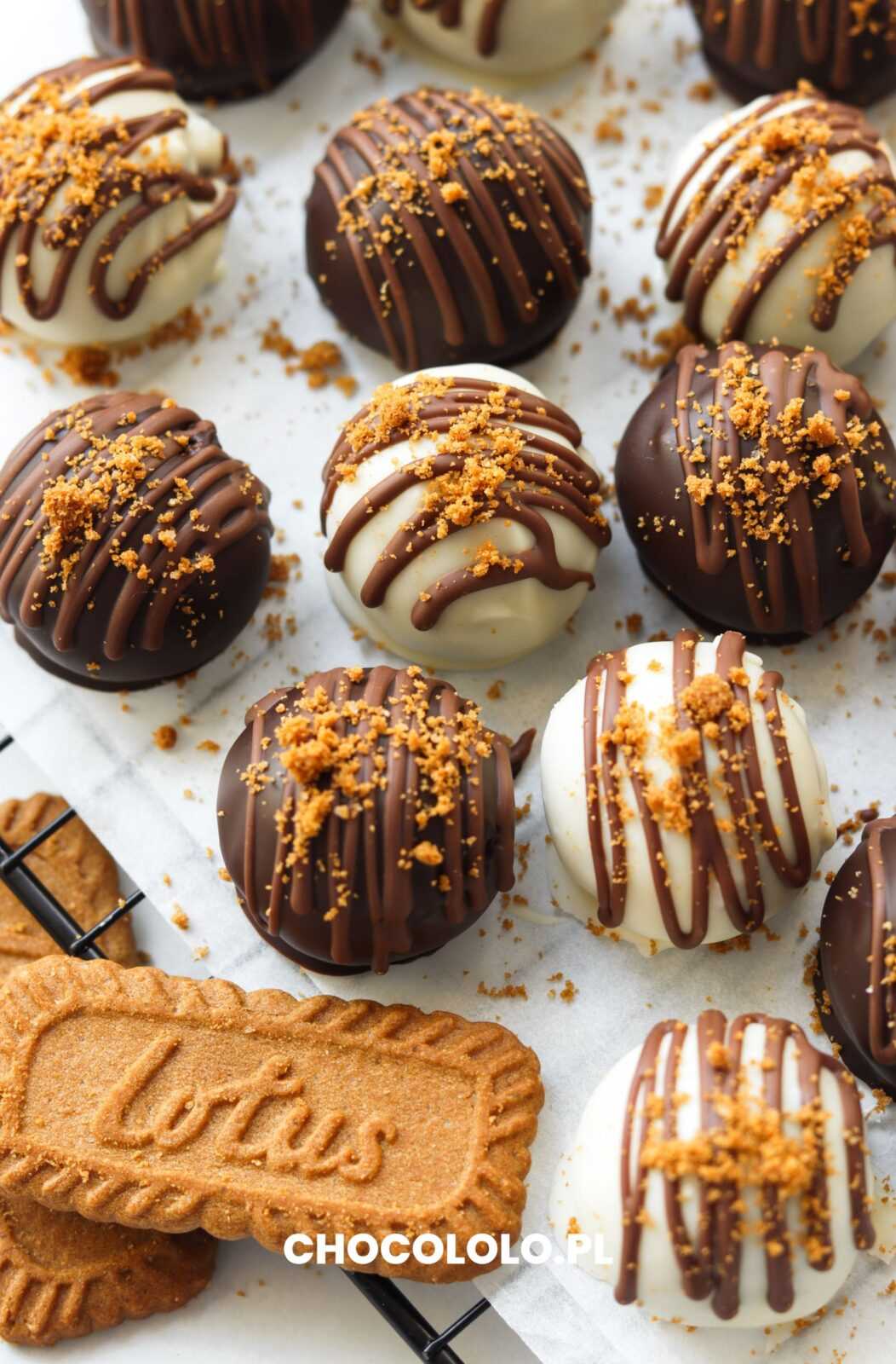 Słodkie trufle w białej i gorzkiej czekoladzie z nadzieniem z ciasteczek i kremu Lotus.